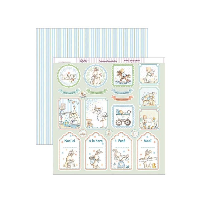 Papel para scrapbooking Dayka, doble cara, etiquetas percentil, día y hora nacimiento-niño.