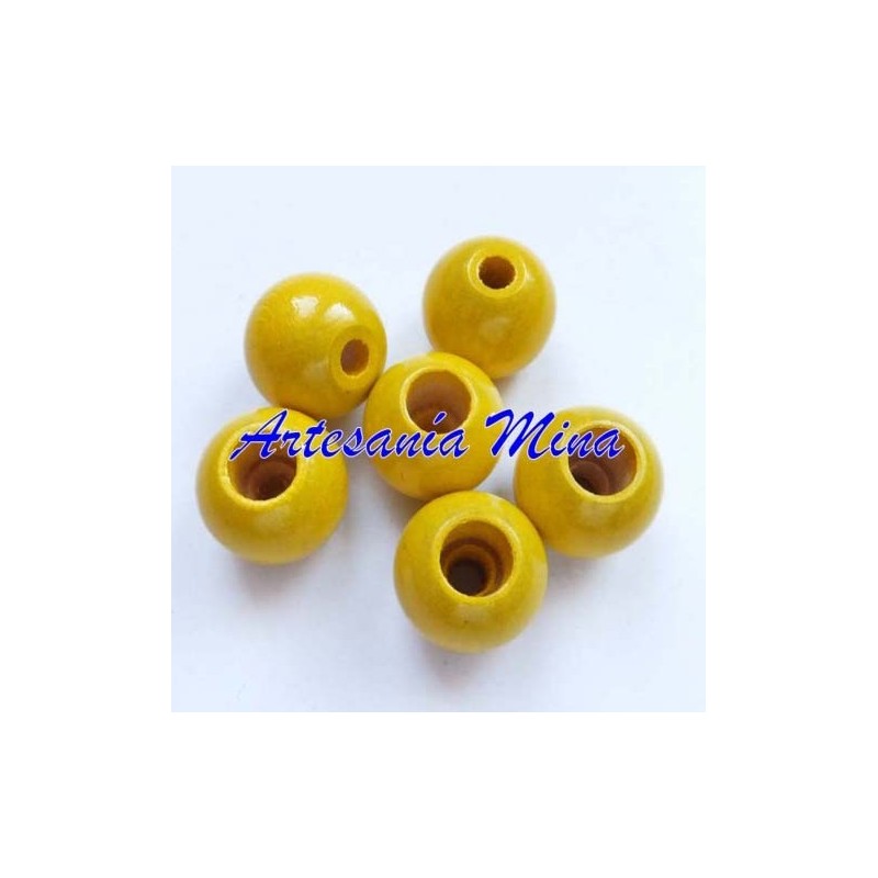 Bola de seguridad madera 12 mm color amarillo, un agujero de 3 mm y otro de 5 mm aprox. Resistente a la saliva y al sudor de los bebés.