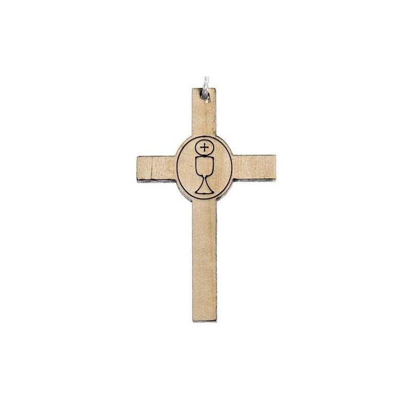 Colgante cruz de madera, con grabado Cáliz, ideal para Primera Comunión.