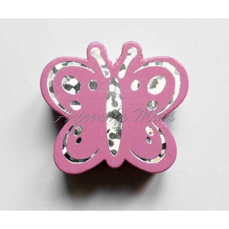 Mariposa de madera rosa lacado 20 mm, con motivo brillante por los dos lados, grosor 10 mm, agujero 3 mm aprox.