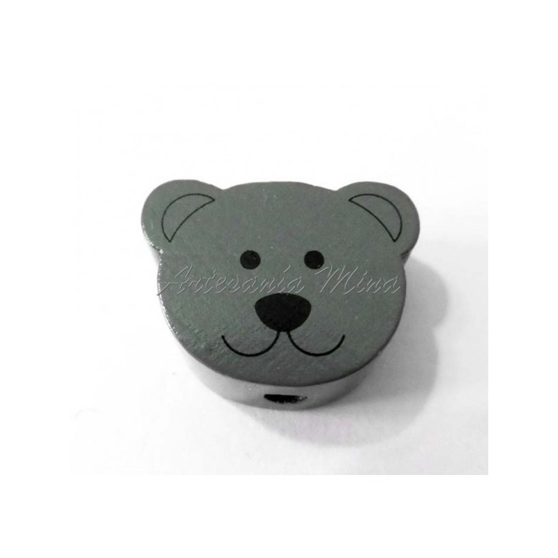 Oso de madera barnizada 20 x 15 mm color gris, con cara del osito por los dos lados, grosor 8 mm, agujero 2,5 mm.