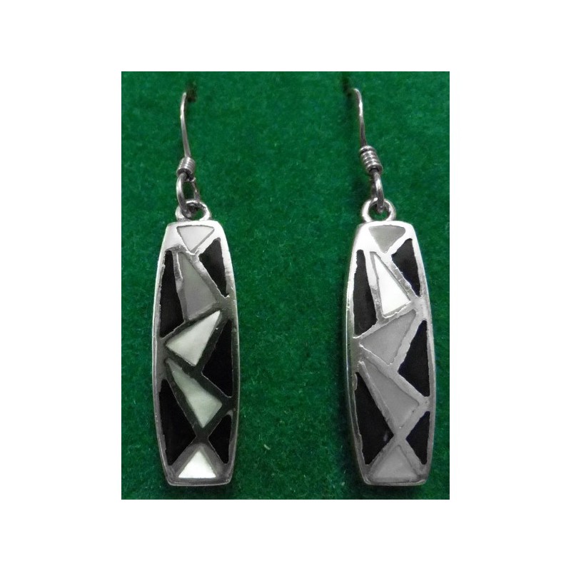 Pendientes en Plata Primera Ley, nácar blanco y esmalte negro, miden 7 x 20 mm, peso 6,6 gramos.
