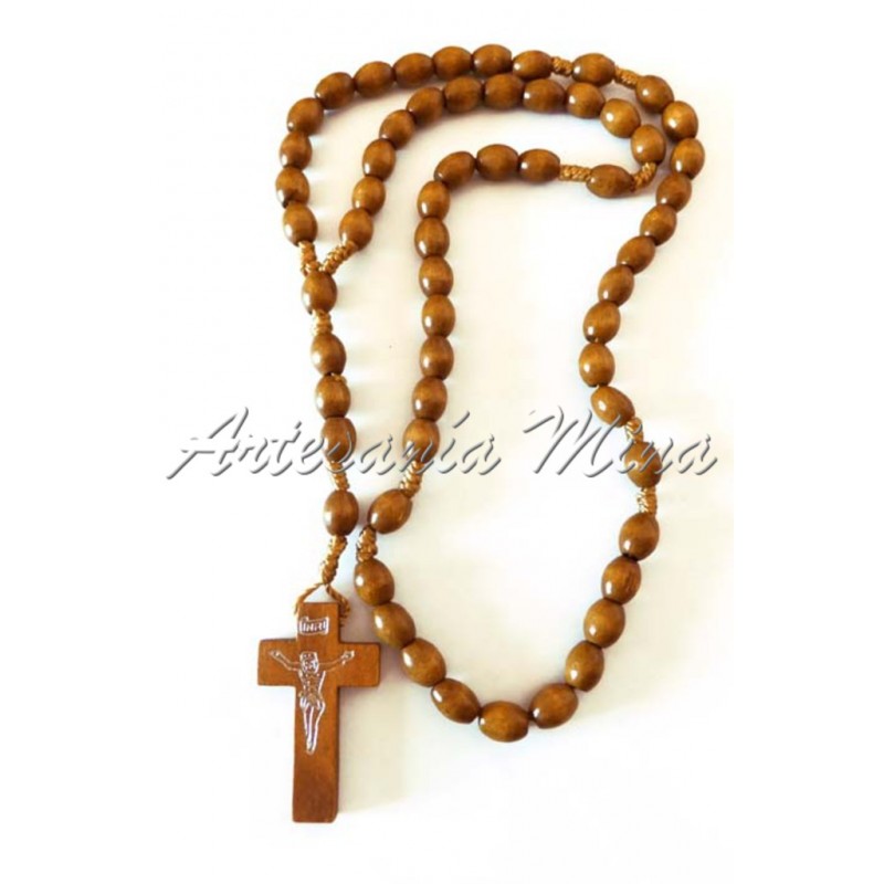 Rosario franciscano de madera natural tintada, con cuentas en forma de olivas.